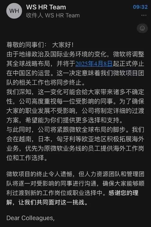 2025年4月7日,上海微创软件公司的员工像往常一样打卡上班。但没过多久,很多人就收到通知要收拾东西走人。根据网上流传的内部邮件截图显示,微软要调整全球布局,决定从4月8日起停止在中国的运营。不过后来证实,这封邮件其实来自微软在中国的合作伙伴——上海微创软件公司,而不是微软自己发出来的。
